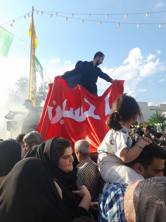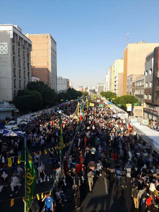 جشن امام رضاییها به نیمه رسیده است. تعدادی از شرکت کنندگان در مراسم دنبال جایی برای نشستن هستند که خستگی در کنند و به ادامه جشن و شادی بپردازند، اما خیل جمعیت هنوز بین میدان ولی عصر و هفت تیر در تردد است. تعدادی از مردم پرچمهایی به دست گرفتند که روی آن جمله معروف شهید حاج قاسم سلیمانی نوشته شده است: «ایران، حرم است»