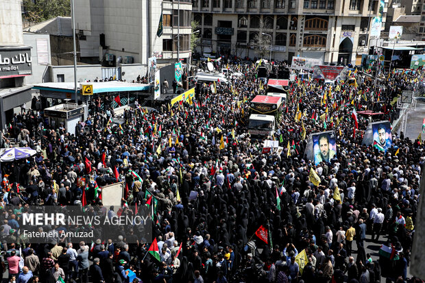 همزمان با راهپیمایی امروز، پیکر مطهر شهدای گرانقدر کنسولگری ایران در دمشق، در تهران تشییع میشود و پس از آن پیکرهای مطهر شهدا به زادگاههای خودشان منتقل خواهد شد.