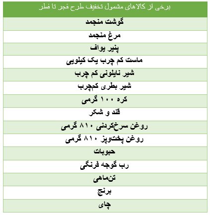 به گزارش خبرگزاری مهر، سعید راد در یک برنامه تلویزیونی اظهار کرد: کالاهایی که در طرح فجر تا فطر مشمول تخفیف ۱۰ تا ۲۵ درصدی هستند شامل گوشت منجمد، مرغ منجمد، قند و شکر، پنیر یواف، ماست کم چرب یک کیلویی، شیر نایلونی کم چرب، شیر بطری کمچرب، کره ۱۰۰ گرمی، روغن سرخکردنی ۸۱۰ گرمی، روغن پختوپز ۸۱۰ گرمی، حبوبات، رب، تنماهی، برنج، چای و برخی از کالاهای دیگر که در فروشگاههای مختلف با توجه به برندهای متنوع، متفاوت است.