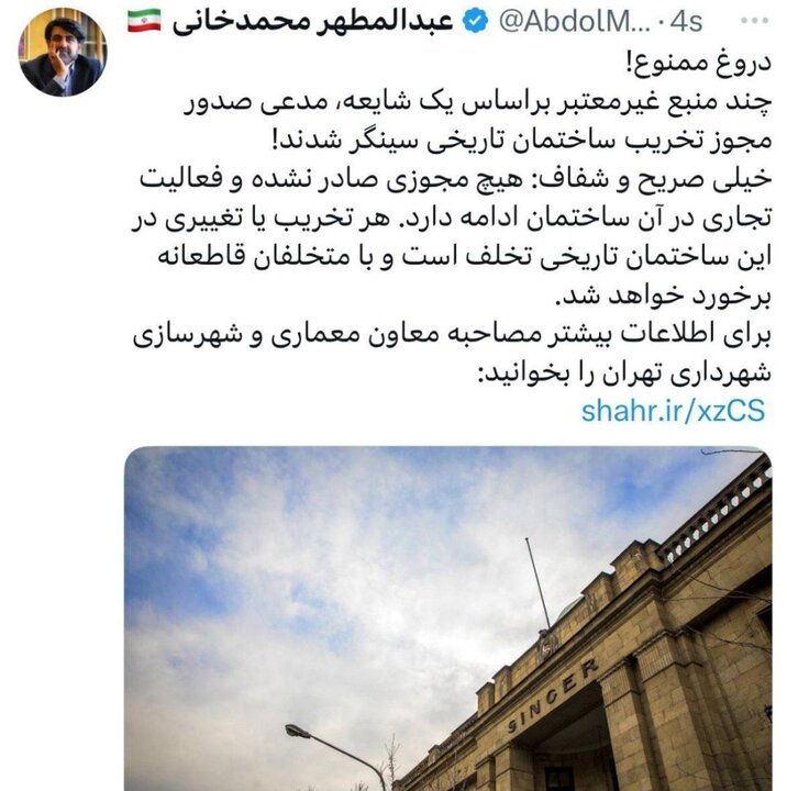 به گزارش خبرگزاری مهر، عبدالمطهر محمدخانی، سخنگوی شهرداری تهران در صفحه شخصی خود در فضای مجازی نوشت: چند منبع غیرمعتبر براساس یک شایعه، مدعی صدور مجوز تخریب ساختمان تاریخی سینگر شدند!