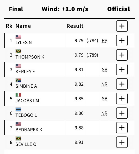 اتفاق عجیب فینال ۱۰۰ متر رد شدن همزمان دو دونده آمریکایی و جاماییکایی بود و هیچکدام نمی دانستند چه کسی قهرمان شده که در نهایت دستگاه فتوفینیش نشان داد که لایلز تنها پنج هزارم ثانیه زودتر از خط پایان رد شده است.